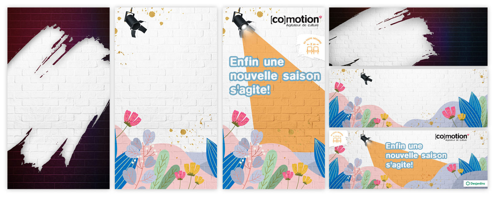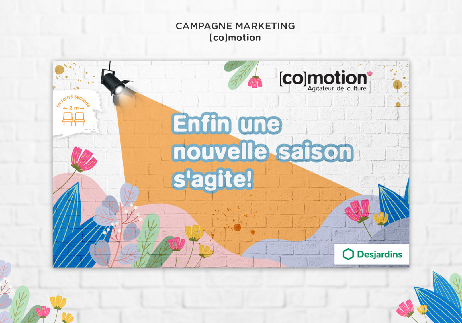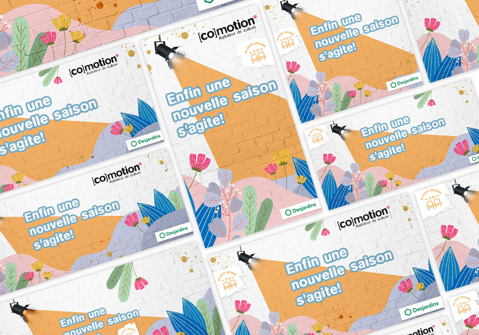 Réalisation de la nouvelle campagne marketing de relance des activités. [co]motion, agitateur de culture, est une entité qui s’occupe, entre autres de la Salle André-Mathieu à Laval. Cette campagne marketing est inspirée des murals/street art, évoque l’arrivée du printemps et la réouverture des salles de spectacles tant attendus !