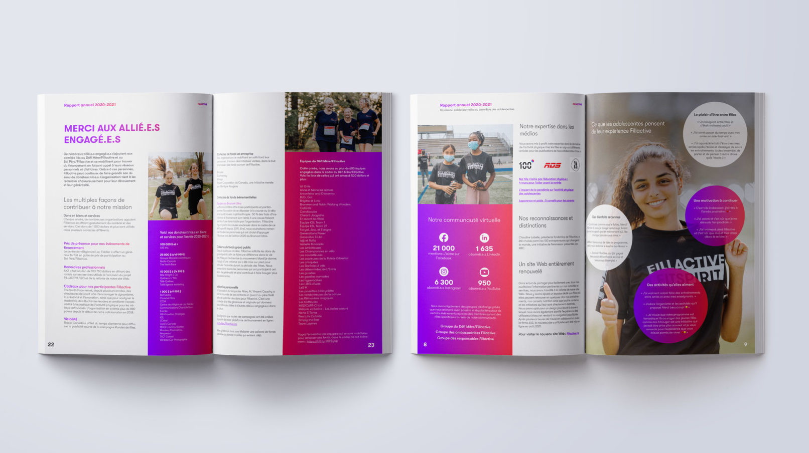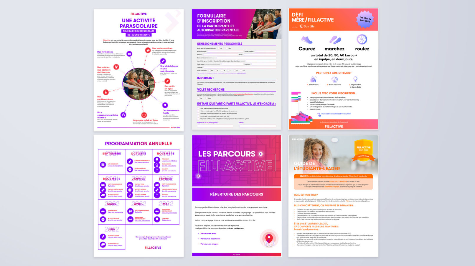 Réalisation graphiques divers Web et Print pour Fillactive. Fillactive est un organisme de bienfaisance basé au Québec dont la mission est d’amener les adolescentes à être actives pour la vie.