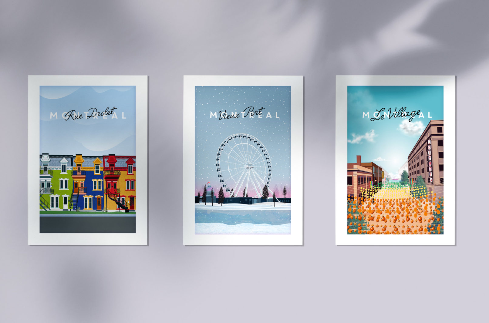 Illustrations de 3 quartiers typiques de Montréal. La rue Drolet sur le plateau Mont Royal, la grande roue du vieux port et la rue sainte Catherine dans le quartier du village.